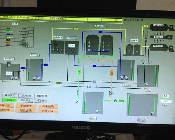 工藝技術參數可在工控機或觸摸屏上進行修改;在線監控主要包括進水和出水水質、水溫、處理流量、加藥流量、水池液位和加藥設備液位等,各液位和水泵、電動閥門等動力設備實現聯鎖控制,自動開停設備,自動報警。將整個處理過程中的各種運行參數以圖形及文字方式動態顯示在工控機或觸摸屏上,操作界面非常直觀。